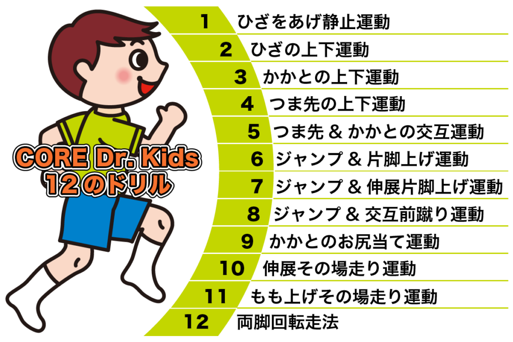 私たち CORE Dr. Kidsでは、走りの技術をフェーズごとに分解し、段階的に正しいフォームを習得できる12のドリルを開発しました。